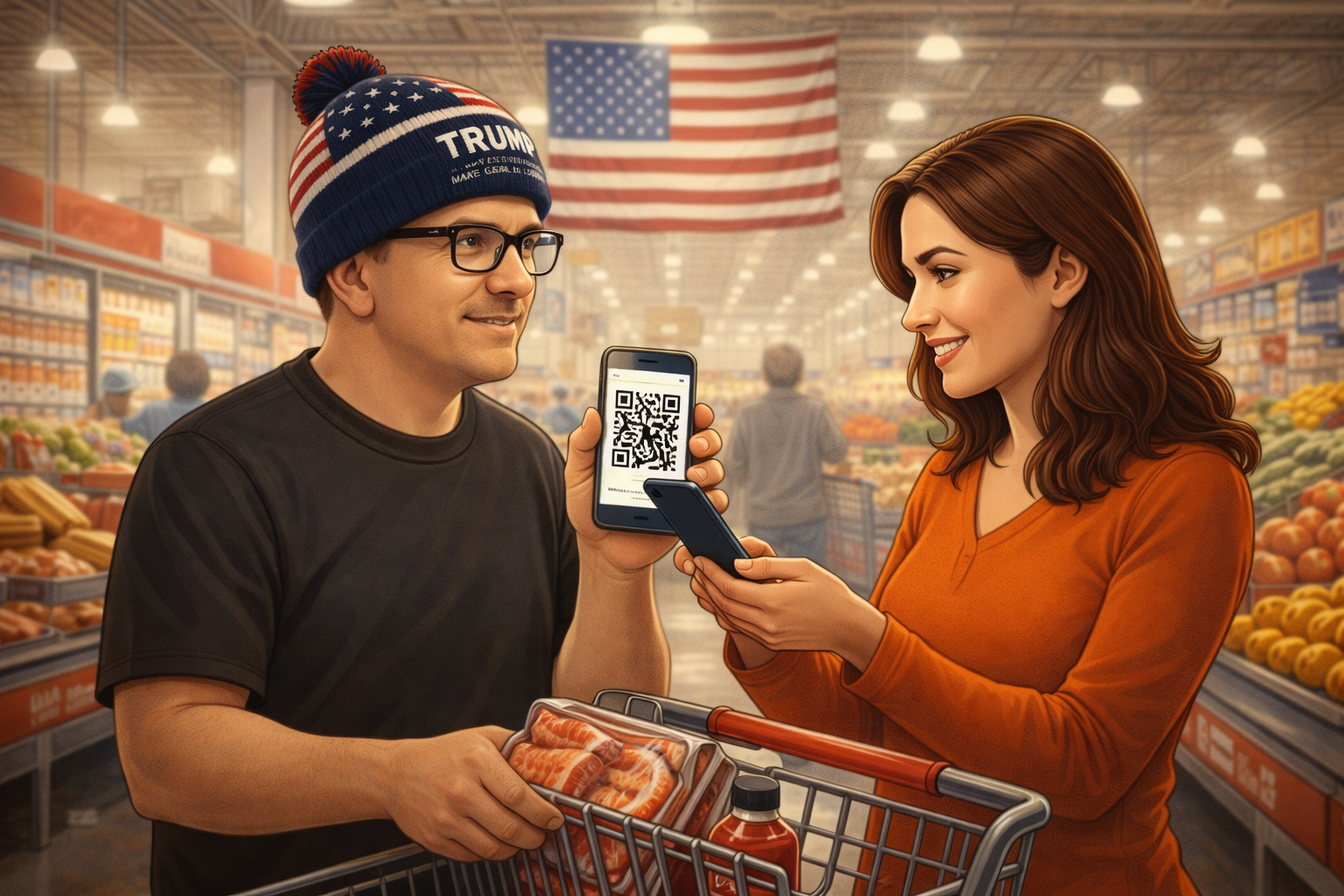 Smiling man wearing a patriotic Trump hat shares his phone screen displaying a QR code with an intrigued woman in an orange top during a casual Costco grocery encounter; mutual smiles and eye contact in the aisle suggest the start of something sweet and unexpected.